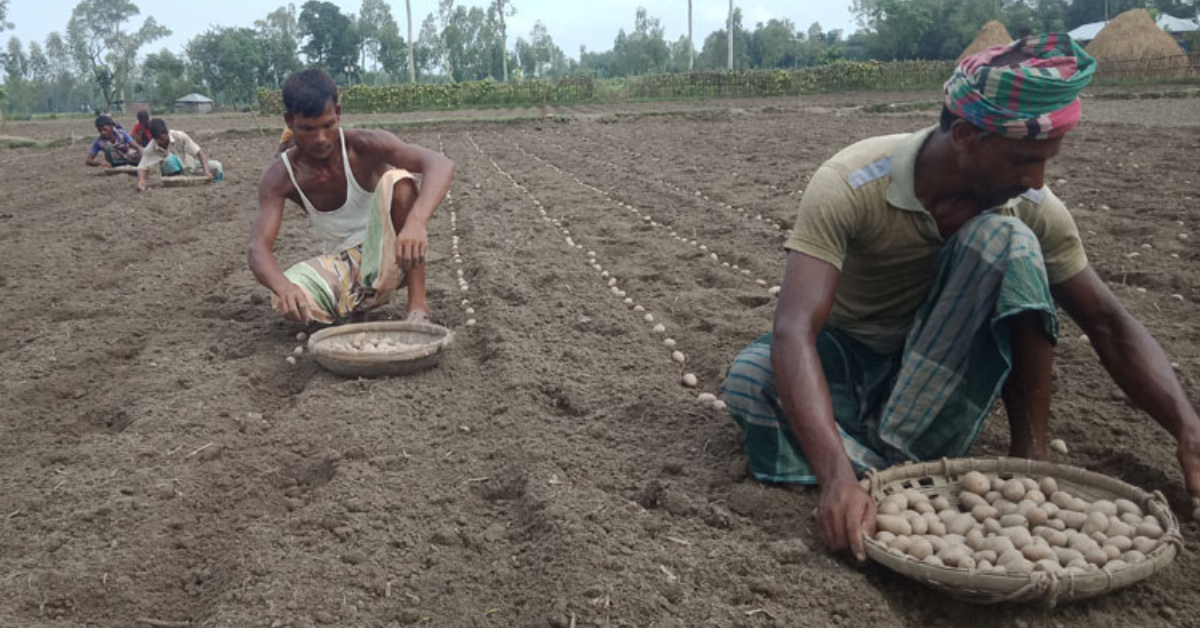 - কেউ বীজ আলু সারিতে লাগাচ্ছেন।