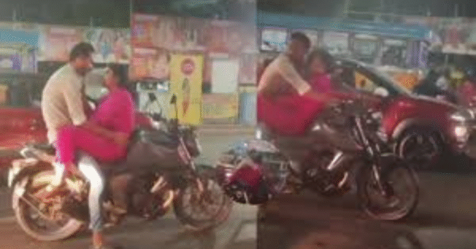 একটি ভাইরাল ভিডিওতে দেখা গেছে, এক যুবক মোটরবাইক চালাচ্ছে আর তার সামনে ফুয়েল ট্যাংকের ওপর বসে আছে এক তরুণী।